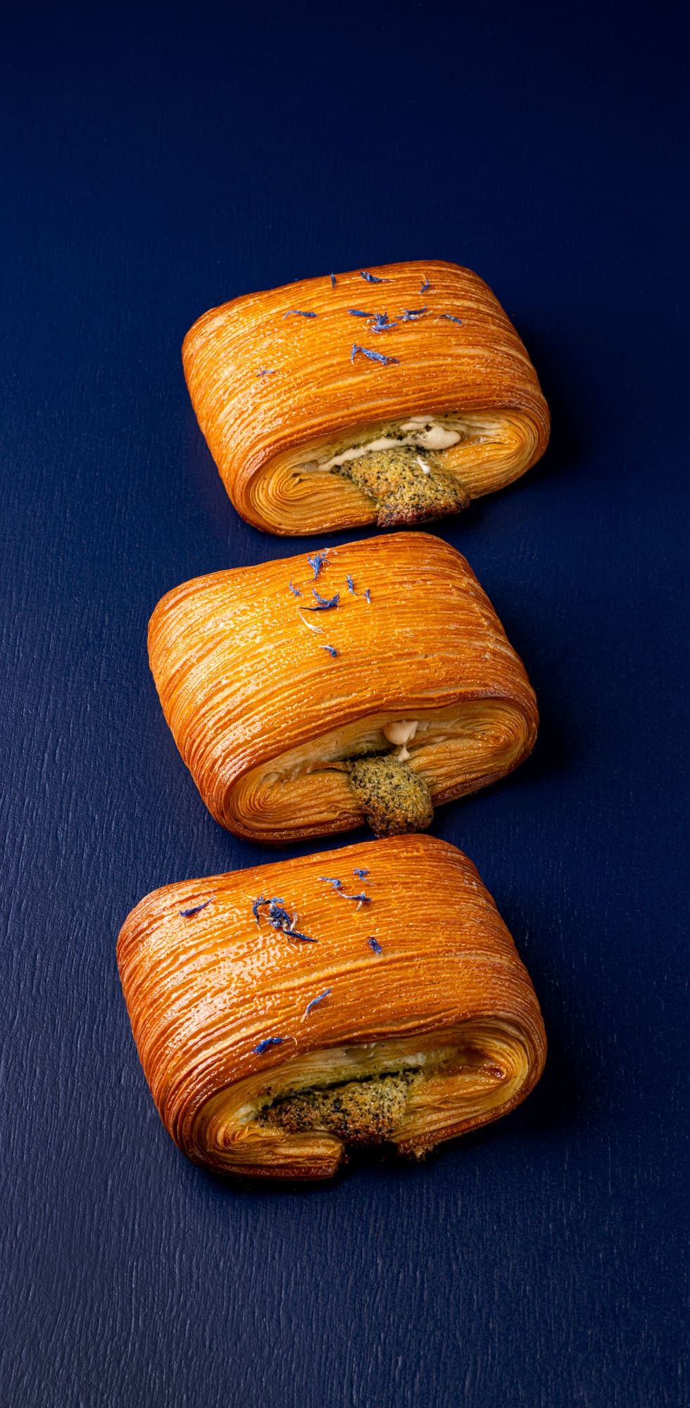Roll out the croissant dough to a final thickness of 3 mm and cut into 5cm×20cm/80g.