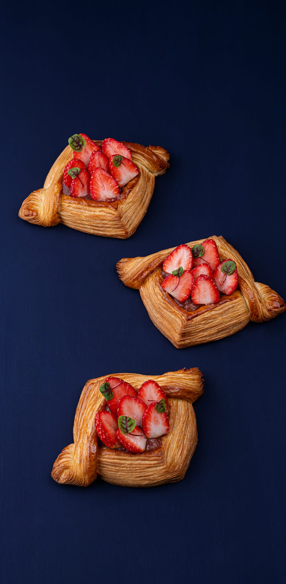 Coupez 4 à 5 petites fraises en deux, placer les fraises sur le croissant et napper de glaçage.